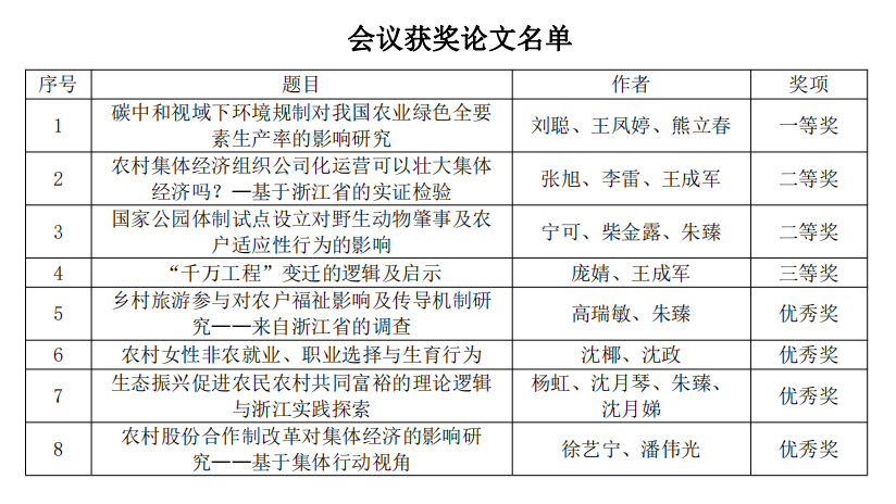 会上,学者专家们围绕推进城乡融合、迈向共同富裕、赋能乡村振兴、“千万工程”的辩证法、浙江省创意农业发展等议题分享了相关领域最新学术与实践成果。本次会议对优秀论文进行了评选和颁奖,共评选出一等奖论文3篇,二等奖论文5篇,三等奖论文9篇,优秀奖论文20篇。其中,必赢官网共有8篇论文获奖,包括一等奖论文1篇,二等奖论文2篇,三等奖论文1篇,优秀奖论文4篇。