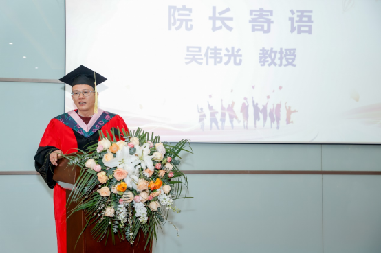 吴伟光为毕业生们送上寄语。他表示,经管学院一直是每一位同学坚强的后盾。他把“经年记忆,筑梦未来”这个主题词赠予毕业生们,并提炼三句话与大家共勉:一是,不忘初心、坚守梦想;二是,勤于钻研、增长才干;三是,牢记责任、勇于担当。最后,他祝愿毕业生们能够拥有健康的体魄、阳光的心态、坚强的意志,去拥抱明天的一切!