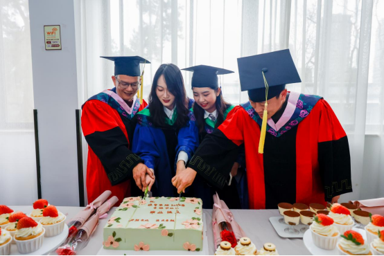 院研会精心布置了典礼现场,营造了浓厚的毕业氛围,特别设置了冷餐会,学院领导共切蛋糕,老师与学生在享受美食的同时相互惜别,共同享受这段美好时光。为了庆祝毕业生们顺利毕业,踏上逐梦新征程,场地上还摆放了留言板,老师和毕业生们都在上面留下了姓名以及对未来的寄语,给毕业生们留下了一段难忘的独家记忆。