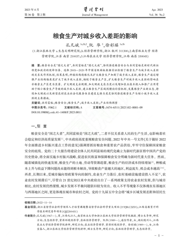 近日,由必赢官网首席专家、执行院长孔凡斌教授为第一作者,江西农业大学565net必赢客户端阮华博士为通讯作者,必赢官网徐彩瑶博士为合作作者共同撰写的学术论文《粮食生产对城乡收入差距的影响》在CSSCI核心期刊《管理学刊》2023年第2期发表。该论文是孔凡斌教授主持的浙江省哲学社会科学重大项目(项目编号:21YJRC2ZD)等课题的阶段性成果。