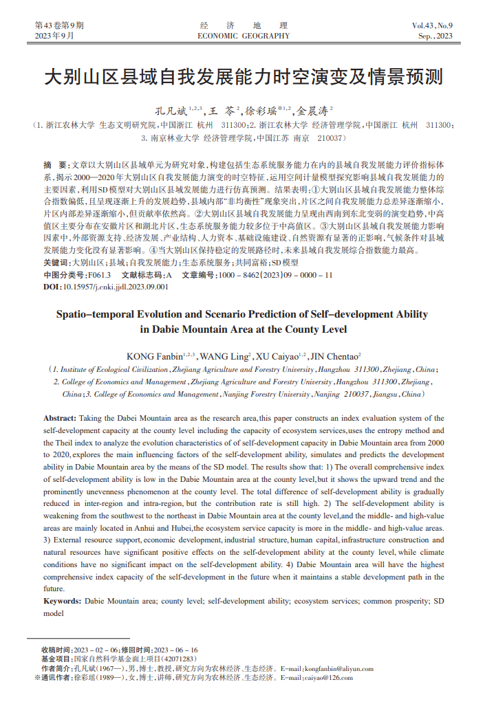 由必赢官网孔凡斌教授团队完成的学术论文《大别山区县域自我发展能力时空演变及情景预测》在浙大一级期刊《经济地理》2023年第9期正式发表。