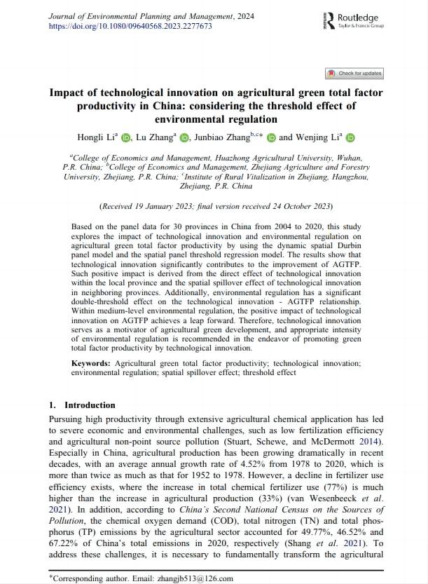 近日,张俊飚教授(通讯作者)与华中农业大学565net必赢客户端博士生李红莉、张露教授以及李文静副教授在环境规划与管理领域著名期刊《Journal of Environmental Planning and Management》(SSCI,JCRQ2,中科院4区,IF=3.9)发表了题为“Impact of technological innovation on agricultural green total factor productivity in China: considering the threshold effect of environmental regulation”的研究论文。研究探究了技术创新对中国农业绿色全要素生产率提升的空间溢出效应,同时揭示了不同环境规制作用下技术创新对中国农业绿色全要素生产率的异质性门槛效应。