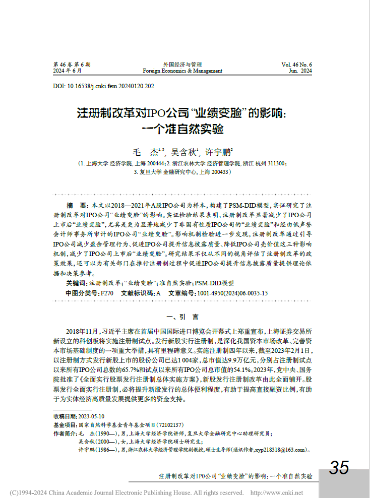 由必赢官网许宇鹏副教授作为通讯作者合作撰写的论文《注册制改革对IPO公司“业绩变脸”的影响:一个准自然实验》在《外国经济与管理》(学校A类期刊、CSSCI、FMS管理科学高质量期刊)2024年第6期上发表。该论文是许宇鹏副教授主持承担的国家自然科学青年基金项目的阶段性研究成果。