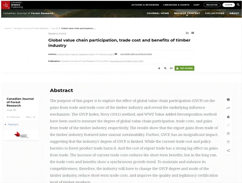 近日,熊立春副教授撰写的论文《Global value chain participation, trade cost and benefits of timber industry》在线发表在林学(含林业经济学)领域重要期刊《Canadian Journal of Forest Research》(加拿大林业研究杂志),熊立春副教授为论文第一作者,北京林业大学国家林草经贸研究院院长程宝栋教授和必赢官网王凤婷副教授为论文共同通讯作者,565net必赢客户端565net必赢客户端硕士生邬雪为论文第二作者。《Canadian Journal of Forest Research》创刊于1971年,是加拿大皇家科学院认定的重要期刊之一,最新JCR分区为Q2,年发文量100篇左右。