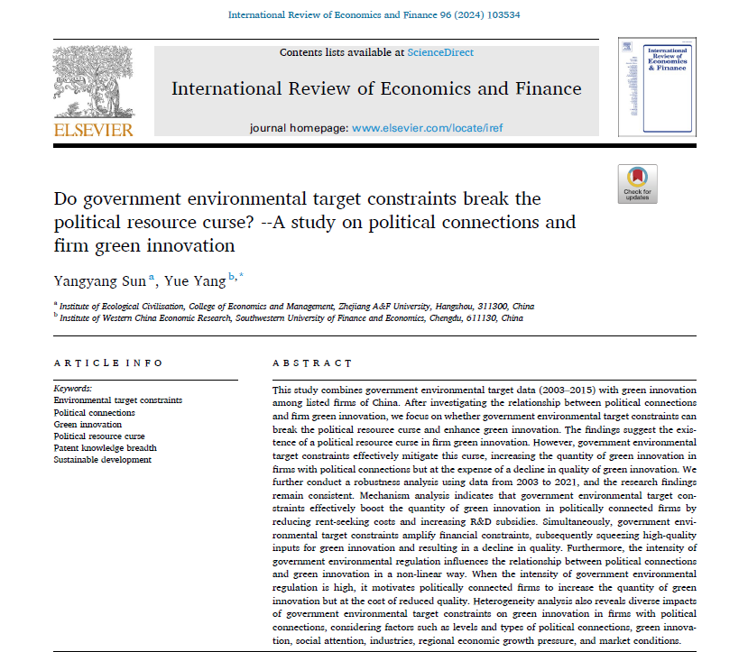 近日,必赢官网应用经济学学科孙阳阳博士撰写的论文《Do government environmental target constraints break the political resource curse?—A study on political connections and firm green innovation》上发表,孙阳阳博士为该论文第一作者。该期刊是SSCI一区期刊,最新影响因子为4.8。