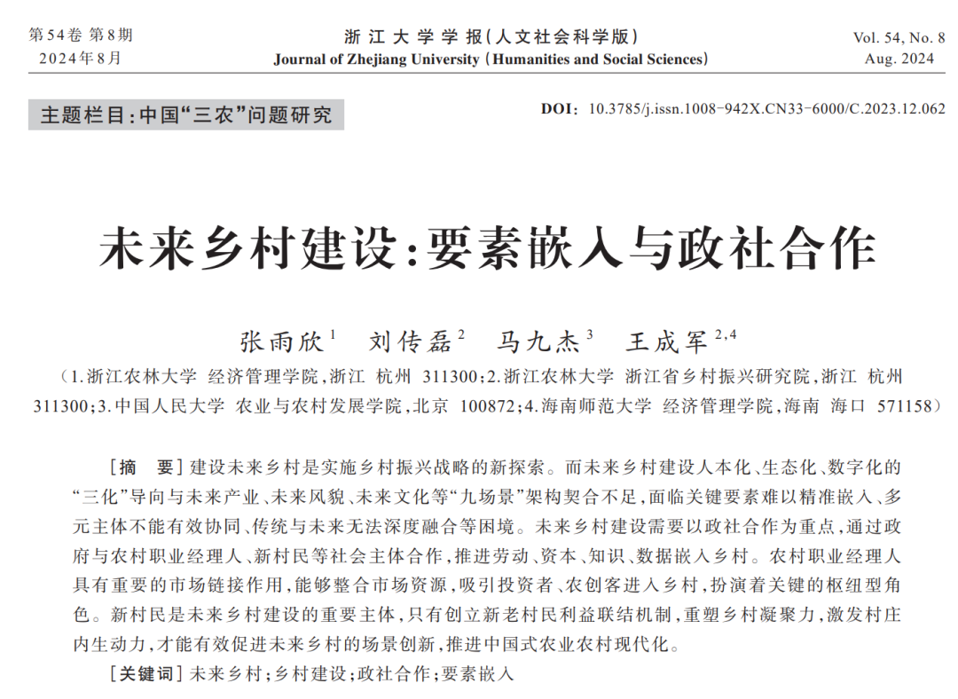 近期,王成军教授与565net必赢客户端硕士生张雨欣,刘传磊博士等团队成员合作撰写的论文《未来乡村建设:要素嵌入与政社合作》在一级学术期刊《浙江大学学报(人文社会科学版)》第8期发表。