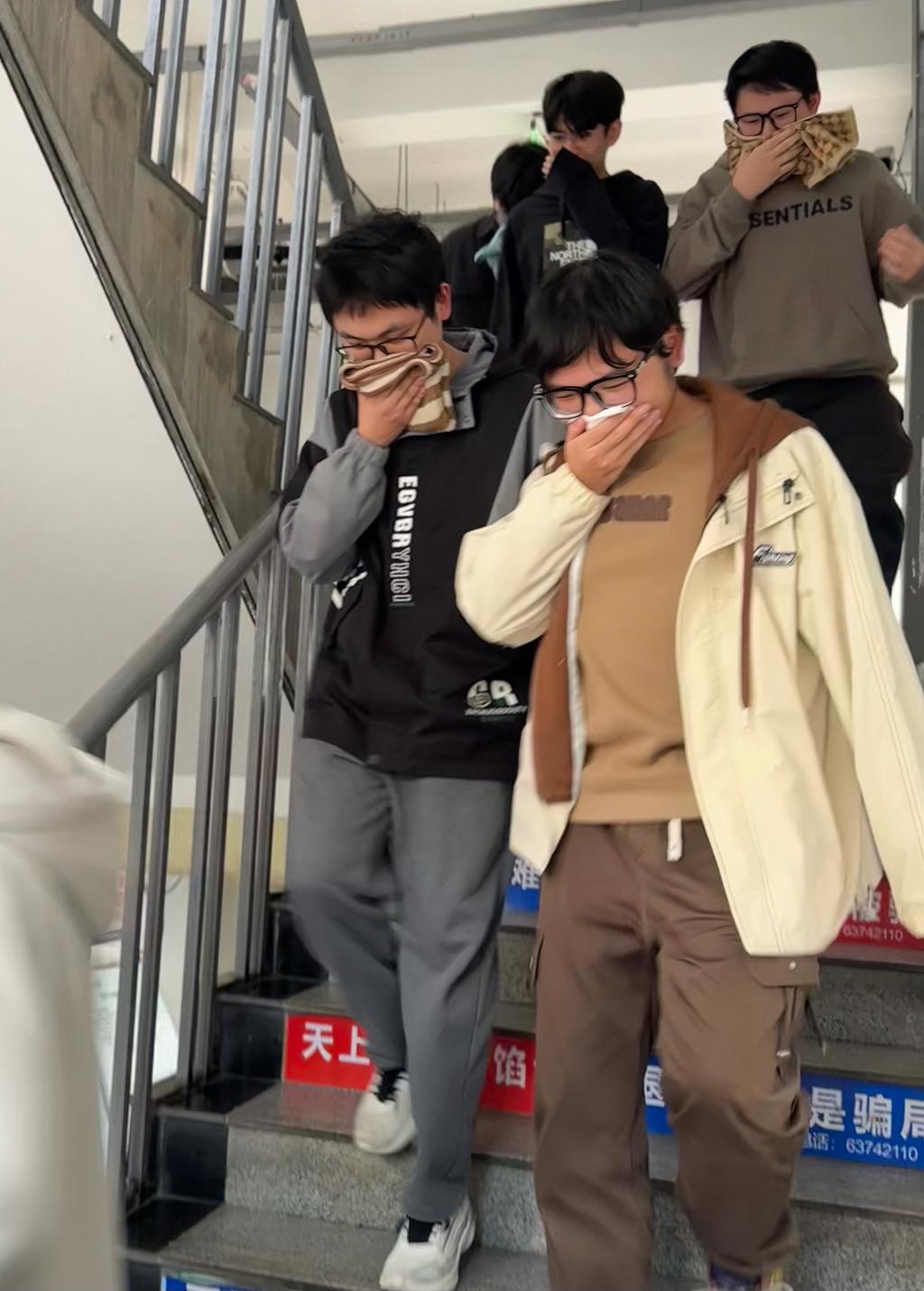 演练开始前,保卫处老师制订了详细的演练方案,并提前向在场师生普及了火灾逃生的基本知识和注意事项。随着模拟火灾的信号声响起,同学们立刻用湿毛巾捂住口鼻,弯腰俯身,按“最短逃生路线”向外撤离。整个疏散逃生过程紧张而有序,达到了演练的预期效果。