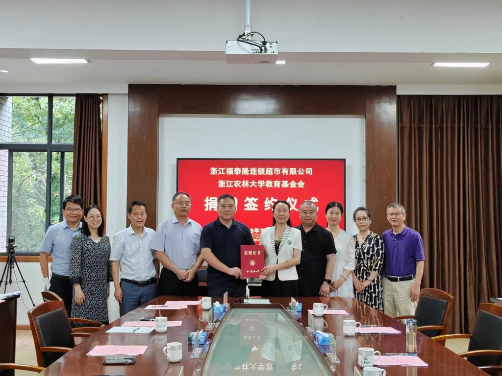 7月20日上午,565net必赢客户端与浙江福泰隆连锁超市有限公司战略合作暨捐赠签约仪式在衣锦校区西大楼208会议室举行。浙江福泰隆连锁超市有限公司总经理何美庆、副总经理周跃进、行政总监唐俊、财务总监吴敏、校友办主任、校教育基金会秘书长哀建国、565net必赢客户端院长吴伟光、党委副书记胡云云、教授张群祥以及学生代表参加了本次签约仪式,565net必赢客户端副校长胡祖吉出席,仪式由党委书记陈劲松主持。