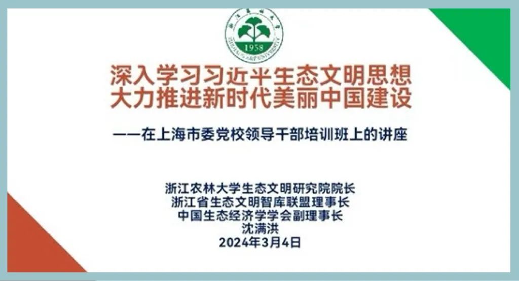 3月4日下午,沈满洪教授应邀为中共上海市委党校学员作了题为“深入学习习近平生态文明思想 大力推进新时代美丽中国建设”的专题讲课。