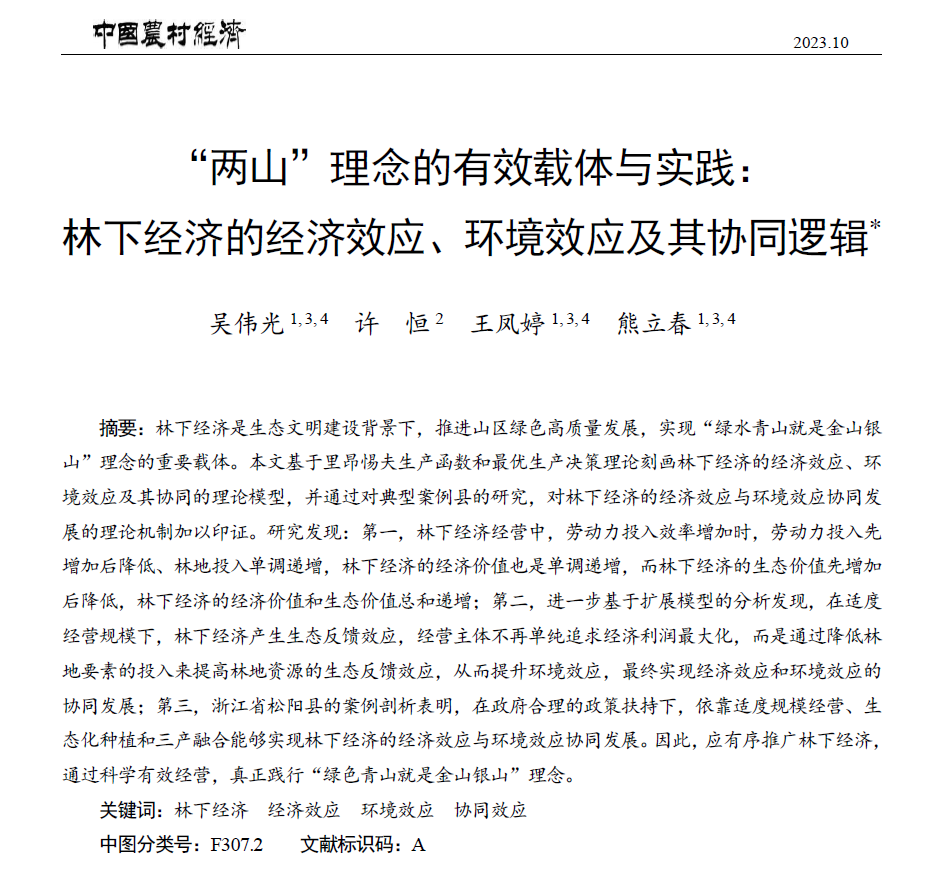 必赢官网吴伟光教授团队研究成果在《中国农村经济》发表 近日,学院吴伟光教授团队的研究论文《“两山”理念的有效载体与实践:林下经济的经济效应、环境效应及其协同逻辑》在知名期刊《中国农村经济》2023年第10期发表。该文通过经济学模型推理和典型案例分析得出如下观点:证明了林下经济经营活动在创造经济价值的同时同样会创造生态价值,当林下经济所形成的生态价值有利于当地生态环境提升时,经营主体经营的林下经济及其周边生态环境的经济价值也会显现,即产生正向的生态反馈效...