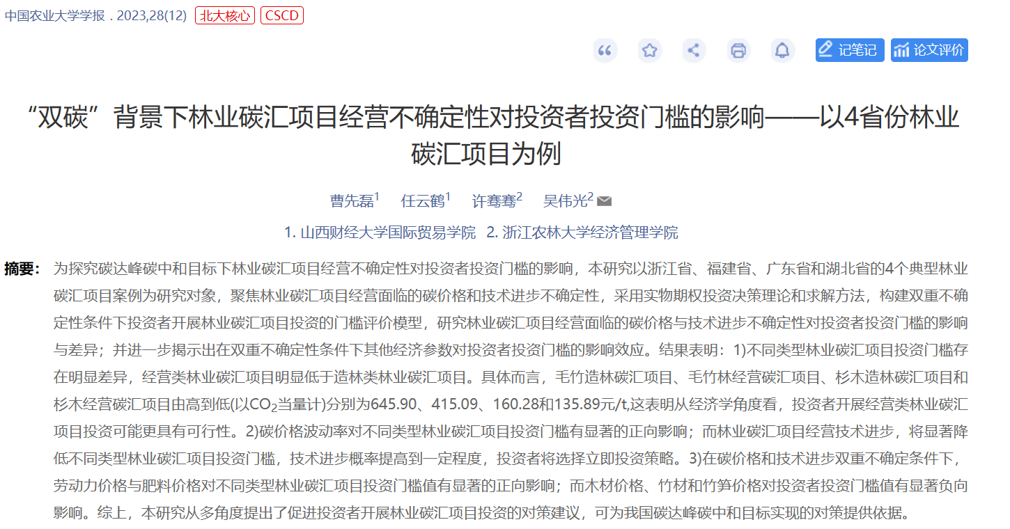 吴伟光教授团队研究成果在《中国农业大学学报》发表 近日,由必赢官网吴伟光教授与山西财经大学曹先磊副教授等人合作撰写的学术论文《“双碳”背景下林业碳汇项目经营不确定性对投资者投资门槛的影响——以4省份林业碳汇项目为例》在《中国农业大学学报》2023年第12期发表;中国农业大学学报为我校A类期刊。吴伟光教授为通讯作者。为探究碳达峰碳中和目标下林业碳汇项目经营不确定性对投资者投资门槛的影响,该论文以浙江省、福建省、广东省和湖北省的4个典型林业碳汇项目案例为研究对...
